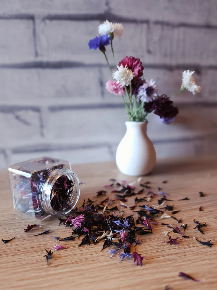 This product offers a mix of our dried cornflower petals that make a wonderful edible confetti. Mixtures may consist of various shades of purples, blues, creams, and pinks, creating an elegant dining experience.