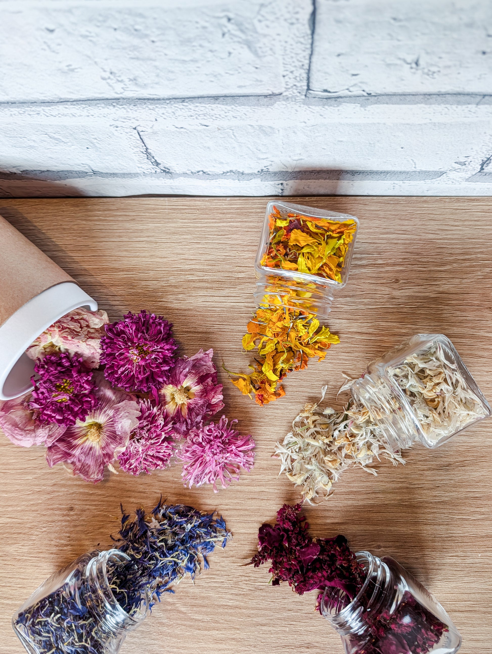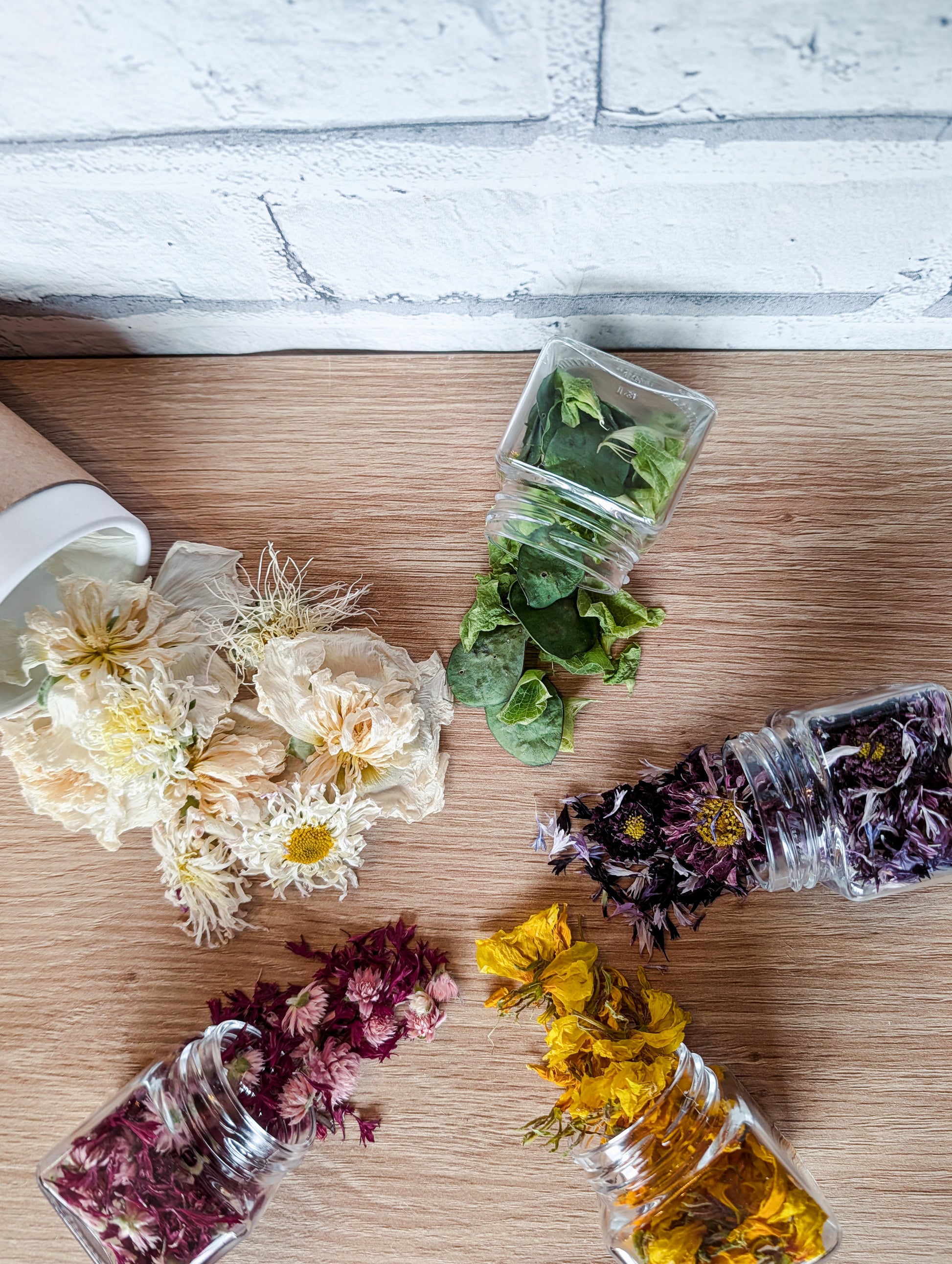 Each Enrichment Pack has 4 jars, and 1 tube of flowers. Each container is inspired by a single colour and has two different botanicals. Enrichment Packs are random and colours can not be selected.